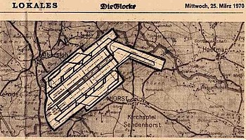 Die Sachverständigen-Kommission hielt jedoch den Ausbau als Regionalflughafen für nicht zweckmäßig und schlug die Verbindung der ersten mit der zweiten Ausbaustufe vor. In dieser zweiten Ausbaustufe soll die in der ersten Stufe geplante Start- und Landebahn auf 4000 Meter verlängert (11,9 Mill. DM), die Rollbahnen auf sieben Kilometer (15,7 Mill. DM) und die Vorfelder auf 392 000 qm erweitert werden (39,2 Mill. DM). Für die Errichtung einer Flugsicherungsanlage, je einer Abfertigungseinheit für den Fluggast- und den Frachtbereich, eines Hallen- und Werft-bereichs, eines betriebstechnischen Bereichs mit Tanklager und eines Verwaltungs- und Hotelgebäudes sind im zweiten Bauabschnitt 90 Mill. DM veranschlagt, für die Straßenverkehrs-erschließung einschließlich der Parkflächen 28,3 Mill. DM und für die Umzäunung 400.000 DM. Spätestens in diesem Bauabschnitt müßte die Straße Sendenhorst - Albersloh verlegt oder aufgehoben werden, denn in den 24,8 Mill. DM für Straßenanschlüsse sind auch Mittel für Umlegungen enthalten. An Parkflächen sind in diesem Ausbaustadium 100.000 qm vorgesehen. Einschließlich 3,3 Mill. DM für den Abbruch von Gehölzen, Abholzen von Wald und