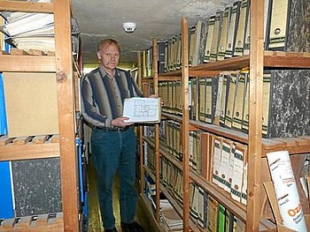 In einem zwischen der zwei Meter hohen Decke und den Holzdielen auf dem Boden gebauten Regal stapeln sich Akten. Diese hat viele Jahre garantiert niemand mehr in die Hand genommen. Werden sie überhaupt noch gebraucht? Specht zuckt mit den Schultern.