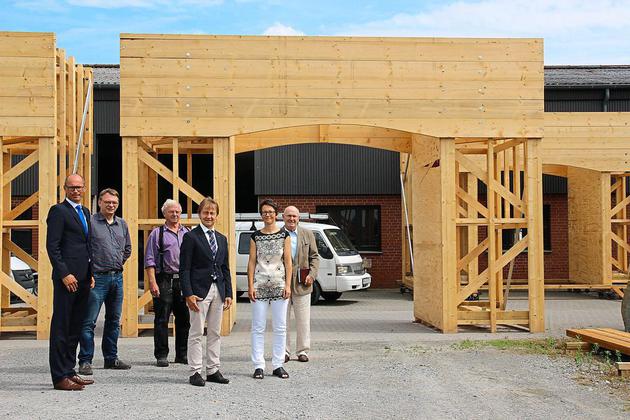 Auf dem Hof der Zimmerei von Robert Greiwe warten die Nachbildungen des Osttorhauses auf ihren Einsatz beim Stadtjubiläum: Roland Klein (Sparkasse Münsterland-Ost), Max Linnemann-Bonse (Heimatverein), Robert Greiwe, Claus Fronholt (Sparkassen-Filialeite