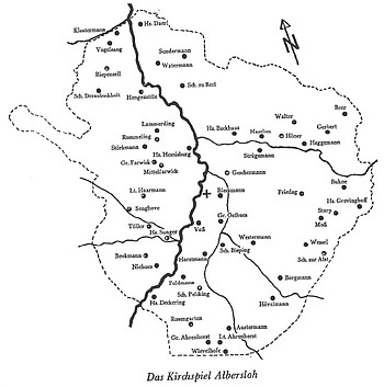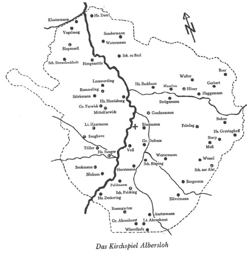 Solche Landstücke mit streifigen Ackerfluren, einsame Inseln im weiten Wald- und Buschland, hat es im Südteile des Ksp. Albersloh (1647 Voß Esch) , sowie westlich und östlich der mittleren Werse gegeben (1532 Buckes Esch). Zu den alten Fluren passen vielfach die Namen benachbarter Höfe, die mit torp (drup) , ithi, loh und anderen Worten zusammengesetzt sind und von der Siedlungsforschung der sächsischen Zeit zugewiesen werdenlO •