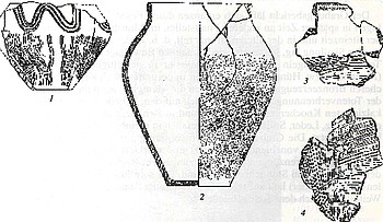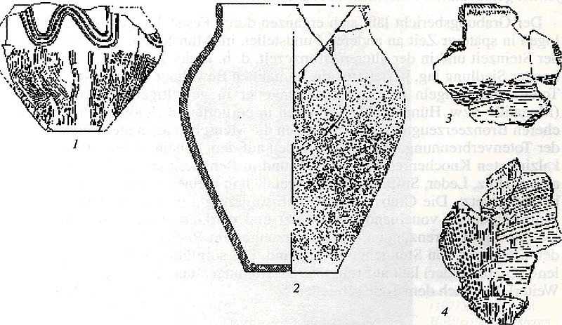 Die Urne verrät starke Beziehungen zum nordostdeutschen Raum (Hannover). Mit ihrer sepiabraunen Farbe und ihrer eigentümlichen körnigen Rauhung des Mittelteils fällt sie eigentlich etwas aus dem Rahmen des bei uns üblichen Tonge­schirrs heraus ... Die senkrechte Kammstrichverzierung [einer weiteren Urne] auf dem Unterteil ist durch nachträglich eingeglättete Streifen unterbrochen. Eigentümlich wirkt die Kombination mit waagerechten, wellenförmigen Horizontreliefen. Das Gefäß fällt außerdem noch dadurch auf daß es mit einer feinen gelbbraunen Tonschicht überzogen ist.