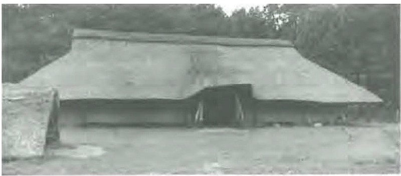 Das Sachsenhaus bei Münster-Gittrup (bei Greven als Sachsenhof wiederaufgebaut). Solche schiffsförmigen Häuser mit vorgezogenem Eingang und schräg gestellten Außenpfosten wurden mit dem Vordringen der Sachsen in ganz Nordwesteuropa verbreitet. Auch die Häuser der Sendenhorster Sachsen werden so ausgesehen haben.
