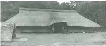 Das Sachsenhaus bei Münster-Gittrup (bei Greven als Sachsenhof wiederaufgebaut). Solche schiffsförmigen Häuser mit vorgezogenem Eingang und schräg gestellten Außenpfosten wurden mit dem Vordringen der Sachsen in ganz Nordwesteuropa verbreitet. Auch die Häuser der Sendenhorster Sachsen werden so ausgesehen haben.Völkerwanderung