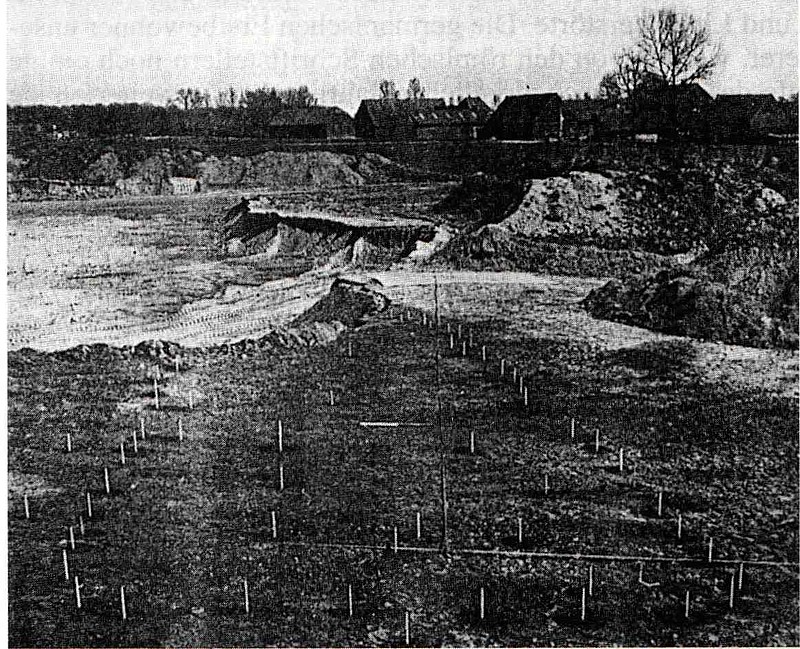 Freigelegter Grundriß eines kaiserzeitlichen Hauses an der Landstraße Sendenhorst - Albersloh (1971). Die weißen Holzleisten markieren die Standspuren der Pfosten.