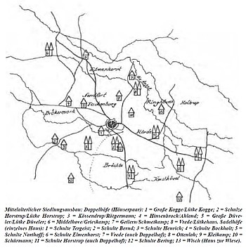 Mittelalterlicher Siedlungsausbau: Doppelhöfe (Häuserpaar): 1 = Große Kogge/Lütke Kogge; 2 = Schulze Horstrup/Lütke Horstrup; 3 = Kössendrup/Rötgermann; 4 = Hinsenbrock/Ahland; 5 = Große Düveler/Lütke Düveler; 6 = Middelhove/Grieskamp; 7 = Geilern/Schmetkamp; 8 = Vrede/Lütkehaus. Sadelhöfe (einzelnes Haus): 1 = Schulte Tergeist; 2 = Schulte Bernd; 3 = Schulte Henrich; 4 = Schulte Bockholt; 5 = Schulte Northoff; 6 = Schulte Elmenhorst; 7 = Vrede (auch Doppelhof); 8 = Ottenloh; 9 = Kleikamp; 10 = Schürmann; 11 = Schulte Horstrup (auch Doppelhof); 12 = Schulte Bering; 13 = Wisch (Haus zur Wiese).